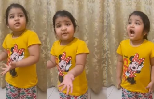 ‘കണ്ണാന കണ്ണേ..’ എന്ന ഹിറ്റ് ഗാനമാണ് പാടുന്നതെങ്കിലും കേൾക്കുന്നവർക്ക് വ്യക്തമാകില്ല. ആരാരിരാരോ എന്നൊക്കെ പാടുന്നത് വ്യക്തമാണെങ്കിലും ചെറിയ ശബ്ദത്തിലൊന്നുമല്ല കക്ഷിയുടെ പാട്ട്. പാട്ട് കേട്ട് ഇളയ കുഞ്ഞ് ഞെട്ടിത്തരിച്ച് കിടക്കുകയാണ്. ഇങ്ങനെയൊരു രസികൻ താരാട്ട് പാട്ട് ഇതിനു മുൻപ് കേട്ടിട്ടില്ലെന്നാണ് പലരും കമന്റ്റ് ചെയ്യുന്നത്.