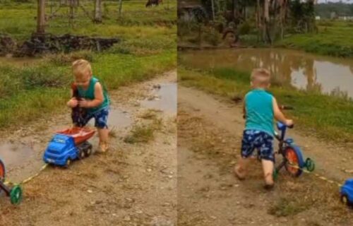 boy trying to brush chicken’s teeth