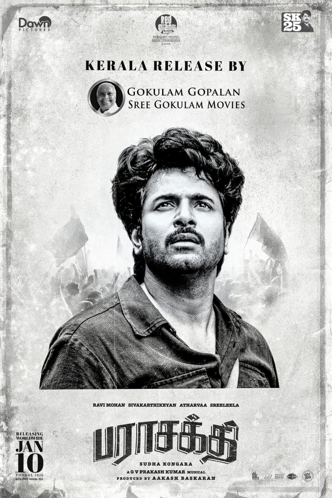 ശിവകാർത്തികേയൻ ചിത്രം പരാശക്തിയുടെ കേരളാ വിതരണാവകാശം ശ്രീ ഗോകുലം മൂവീസ് കരസ്ഥമാക്കി: ചിത്രം ജനുവരി 10ന് തിയേറ്ററുകളിലേക്ക്