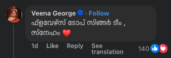 ഇതിന് പിന്നാലെ, ടോപ് സിംഗറിലൂടെ വീണ ജോർജ്ജിനോടുള്ള സ്നേഹം അറിയിച്ച ഫേസ്ബുക്ക് റീലിന് മന്ത്രി വീണ ജോർജ്ജിന്റെ കമന്റ്. “ഫ്ളവേഴ്സ് ടോപ് സിംഗർ ടീം, സ്നേഹം.”